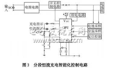 分段恒流充電智能化控制電路如圖3 所示。該電路采用CPU 控制,可對(duì)充電電池和充電環(huán)境溫度進(jìn)行檢測(cè),對(duì)電池充電進(jìn)行計(jì)時(shí),采樣充電過程中電池的電壓和電流,對(duì)分段恒流充電過程進(jìn)行控制。