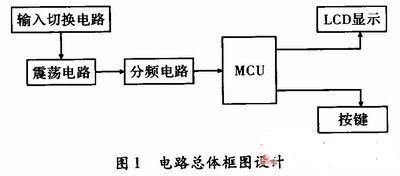 如圖1所示??驁D包括輸入切換部分、振蕩部分、分頻部分、單片機(jī)部分、顯示部分和鍵盤部分。此系統(tǒng)由STC89C51單片機(jī)作為控制核心,輸入切換部分采用雙刀雙擲繼電器完成待測電容或電感的線路切換,振蕩電路工作在放大諧振狀態(tài),頻率有高頻管9018的集電極輸出,由于頻率較高,所以需經(jīng)過信號分頻,再者由于輸出的電壓幅度大,此處無需再加一級驅(qū)動,以74LS393數(shù)字分頻芯片,把分頻端級聯(lián)實(shí)現(xiàn)100分頻,最終信號進(jìn)入單片機(jī),由單片機(jī)計(jì)算出頻率,經(jīng)過算法設(shè)計(jì),實(shí)現(xiàn)未知電容或電感參數(shù)的測定。圖1給出了系統(tǒng)的總體框架圖。