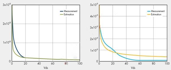 圖2(a)顯示了輸出電容的測量值及由公式(3)得出的擬合曲線。然而,對于具有更多非線性特性的新式超級結(jié)MOSFET而言,則簡單的指數(shù)曲線擬合有時不夠好。圖2(b)顯示了最新技術(shù)MOSFET的輸出電容測量值及用公式(3)得出的擬合曲線。兩者在高壓區(qū)的差距將導致等效輸出電容的巨大差異,因為在積分公式中電壓與電容是相乘的。圖2(b)中的估計將得出大得多的等效電容,這會誤導轉(zhuǎn)換器的初始設計。
