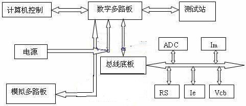 熱阻測試系統(tǒng)的基本構(gòu)架是計(jì)算機(jī)通過軟件控制精密模擬和數(shù)字電路,實(shí)現(xiàn)對(duì)被測器件的條件施加→結(jié)果采樣→篩選→計(jì)算→比較→判別等一系列程序控制,完成對(duì)被測器件電參數(shù)的自動(dòng)測試,每次測試的全過程小于0.2秒。系統(tǒng)主要有模擬多路板、數(shù)字多路板、ADC板、Im 板、Ie板和Vcb板組成,如圖1所示。