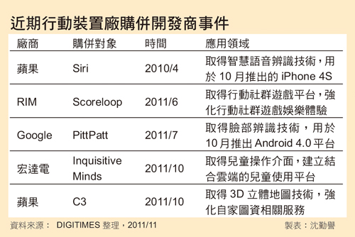 移動(dòng)裝置市場(chǎng)競(jìng)爭(zhēng)激烈,蘋(píng)果、Google、宏達(dá)電等大廠為凸顯產(chǎn)品獨(dú)特性,購(gòu)并開(kāi)發(fā)商成為重要布局。