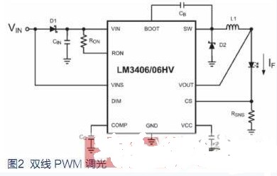 雙線PWM調(diào)光是用于汽車內(nèi)部照明的常見方法。當(dāng)VIN被調(diào)制為低于 VIN-NOMINAL的 70% 時(shí),VINS引腳(圖2)檢測(cè)電壓的變化,并將PWM波形轉(zhuǎn)換為和輸出驅(qū)動(dòng)電路相應(yīng)的PWM。這種方法的缺點(diǎn)是轉(zhuǎn)換器的電源必須包含一個(gè)電路,以便為其直流輸出提供 PWM 波形。