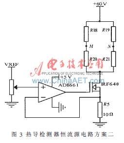 如果只是單純地將IRF640放在電橋的上方,而不加線性光耦HCNR201。如圖4所示,當(dāng)場效應(yīng)管IRF640截止,則M、N上的共模電壓為零,這樣雖然可以避免圖3方案的問題,但是當(dāng)橋流較大時(200 mA,橋電阻為100Ω),則場效應(yīng)管IRF640的柵極電壓達到20多伏,超過了AD8661的電源電壓范圍(±18 V)。因此圖3、圖4方案都不可行。