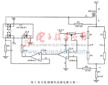 如圖2所示為恒流源的電路圖。輸出信號為M、N,即通過測量M、N兩點間的電位差,就能測出物質(zhì)的成分和含量。圖2中R5是采樣電阻,阻值10 Ω,當(dāng)電流為上限250 mA時,采樣電壓為2.5 V,采樣電壓輸入到AD8662的2腳,AD8662的3腳接電位器RW,RW的一端接地,另一端接+2.5 V電壓基準,此+2.5 V是通過穩(wěn)壓芯片ADR431輸出,溫度穩(wěn)定1 ppm/℃。設(shè)定好電位器的電壓后,當(dāng)AD8662的2腳、3腳電壓不相等時,其差壓經(jīng)運放AD8662開環(huán)放大(開環(huán)放大倍數(shù)2.2×105)驅(qū)動AD8662的5腳,U1B和線性光耦HCNR201構(gòu)成光耦隔離的放大電路,放大比為500 K/75 K=6.7倍。AD8662和HCNR201構(gòu)成放大比1.47×106的差壓放大電路,并且起到穩(wěn)流作用。當(dāng)橋流有0.1 μA的波動時,施加到IRF640柵極的電壓變化達1.47 V,使IRF640增加或減小電流,從而消除電流波動。