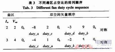 空間矢量調(diào)制法只確定開(kāi)關(guān)間隔中應(yīng)用電壓矢量的占空比,從而獲得低頻率的輸出電壓和輸入電流的平均值,但是并沒(méi)有確定使用的順序。所以需要使用雙空間矢量調(diào)制法,同時(shí)也可改善波形的質(zhì)量。圖2表明了輸入電流在4扇區(qū),輸出電壓在5扇區(qū)應(yīng)用雙空間矢量調(diào)制的順序。電壓矢量在開(kāi)關(guān)間隔中對(duì)稱分布,零矢量每4個(gè)開(kāi)關(guān)間隔使用一次。在每次開(kāi)關(guān)轉(zhuǎn)換中只有一個(gè)開(kāi)關(guān)狀態(tài)發(fā)生改變以最大程度地降低損耗。在圖2中通過(guò)表格2確定相應(yīng)開(kāi)關(guān)時(shí)間: