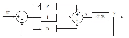 PID 控制原理如圖2 所示。PID 控制是一種線性調節(jié)器, 它把設定值W 與實際輸出值相減, 得到控制偏差e .偏差值e 經比例、積分、微分后通過線性組合構成控制量U, 對對象進行控制。其中比例調節(jié)器起到基礎調節(jié)作用, 主要對控制系統(tǒng)的靈敏度和控制速度有影響。積分調節(jié)器可以自動調節(jié)控制量, 消除穩(wěn)態(tài)誤差,使系統(tǒng)趨于穩(wěn)定。微分調節(jié)器可以減小超調, 克服振蕩, 同時加快系統(tǒng)的穩(wěn)定速度, 縮短調整時間, 從而改善系統(tǒng)的動態(tài)性能。