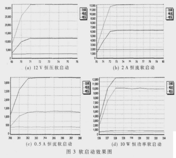 從圖3 的軟啟動效果圖可以看出, 在恒定電壓、電流、功率的模式下工作時, 系統(tǒng)開機過程超調量很小, 有效地控制了啟動過程, 防止了啟動過程產生過大的擾動電壓, 產生過大的功率, 有效地保護了負載。