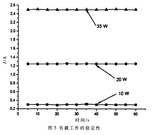 由于輸出電流達到8 A, 對電源的功率要求較高, 易產生噪聲, 這種隨機噪聲也會對輸出電流產生一定的影響。為減弱這種噪聲, 各個模塊分別供電, 以減少交叉干擾, 同時在電路板上多加裝去耦濾波電容, 減小干擾的影響, 同時OPA549 能有效地抑制紋波。影響電源穩(wěn)定性的因素很多, 如負載的變化、取樣電阻的變化、A/D、D/A 的影響等。如圖4 所示, 不同負載的情況下, 電源誤差不同。10 W 的負載, 由于功率較低, 在電壓、電流增加時, 誤差變化也較小。35 W 的負載, 由于功率較大, 工作電流的變化范圍比較大, 功耗較大, 電源的誤差變化相應地也比較大。如圖5, 在10 W、20 W 和35 W 的負載時, 工作狀態(tài)穩(wěn)定, 能夠滿足大電流、大功率的需要。
