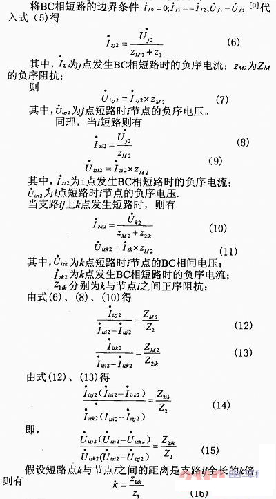 那么可以確定,此時相問短路故障發(fā)生在支路ij上。然后確定短路點距離f節(jié)點的距離。由于配電線路長度較短,所以配電線路的阻抗相對較小,分段器之間負(fù)荷分支又很多,很難做到精確的定位,本文提出一種負(fù)序電壓比對的方法,避免了上述問題,取得相當(dāng)不錯的效果,能夠給出較為準(zhǔn)確的距離定位。