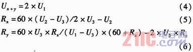 如圖2所示,U+和U-為被測線路的母線供電電壓,正常工作時兩母線間的電壓差Ux+y為440 V,且隨蓄電池內(nèi)阻變化。Rx,Ry分別為被測線路的正母線絕緣電阻和負(fù)母線絕緣電阻。正、負(fù)母線絕緣電阻反映的是64路的正、負(fù)支路的總體絕緣性能,等效于各個支路的正、負(fù)絕緣電阻的并聯(lián),正常時兩母線絕緣電阻>20 kΩ。Ux和Uy為正負(fù)母線對地電壓,大小隨正負(fù)母線的絕緣電阻變化,但兩母線電壓差恒定為Ux+y。為了檢測正負(fù)母線電壓Ux,Uy,Rx,Ry,系統(tǒng)采用了“平衡-不平衡檢測法”檢測母線電壓和母線絕緣電阻。計(jì)算公式如式(1)所示。