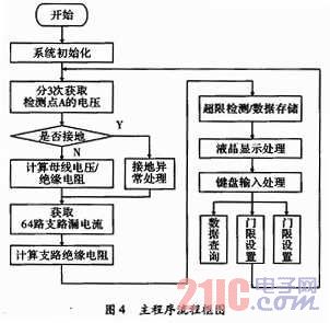 整個程序的編寫均由C語言完成,在程序設(shè)計(jì)中,采用了結(jié)構(gòu)化程序設(shè)計(jì)方法,使各個模塊程序相對獨(dú)立,便于程序代碼的維護(hù)、移植和升級。同時,這樣分離式的程序設(shè)計(jì),降低了代碼的調(diào)試難度,縮短了調(diào)試周期。將與接地故障信息(如母線電壓,母線絕緣電阻,支路絕緣電阻,接地支路號等)密切相關(guān)的數(shù)據(jù)放在一個結(jié)構(gòu)體里,便于掉電存儲與回放顯示。系統(tǒng)的主程序流程圖,如圖4所示。