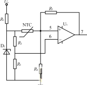 圖4為變壓器過熱保護(hù)電路,R3=R4,NTC為粘貼在變壓器上的負(fù)溫度系數(shù)的熱敏電阻,常溫下RNTCR2,運(yùn)放U1構(gòu)成滯環(huán)比較器。正常工作時,NTC阻值較大,運(yùn)放U+<U-,輸出為零;當(dāng)溫度上升到設(shè)定值時,運(yùn)放U1輸出為高電平,送到PWM控制芯片使輸出脈沖關(guān)斷。