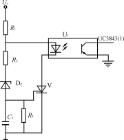 圖5為輸出過電壓保護(hù)電路。穩(wěn)壓管DZ的擊穿電壓稍大于輸出電壓額定值,輸出正常時,DZ不導(dǎo)通,晶閘管V門極電壓為零,不導(dǎo)通。當(dāng)輸出過壓時DZ擊穿,V受觸發(fā)導(dǎo)通,使光耦輸出三極管電流增大,通過UC3843控制開關(guān)管關(guān)斷。