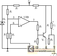 圖6為空載保護(hù)電路。為了防止變壓器繞組上電壓過高,同時也為了使電源從空載到滿載的負(fù)載效應(yīng)較小,開關(guān)穩(wěn)壓電源輸出端一般不允許開路。圖6中R2R3,給運(yùn)放同相輸入端提供固定的小電壓U+。R8為取樣負(fù)載電流的分流器,當(dāng)外電路未接負(fù)載RL時,R8上無電流,運(yùn)放反相輸入端電壓U-=0,因而U+>U-,運(yùn)放輸出電壓較高,使三極管V1飽和導(dǎo)通,將電源內(nèi)部的假負(fù)載R7自動接入。當(dāng)電源接入負(fù)載RL時,R8上的壓降使U->U+,運(yùn)放輸出電壓為零,V1截止,將R7斷開。
