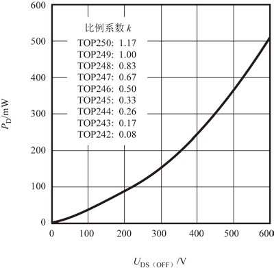 (4)k值所代表的就是TOPSwitch-GX系列中不同型號(hào)芯片的通態(tài)電阻比值,它也是極限電流比值。例如TOP249Y的R DS(ON) =2.15Ω(典型值),TOP250Y的R DS(ON) =1.85Ω(典型值),2.15Ω/1.85Ω=1.162,而對(duì)TOP250Y而言,比例系數(shù)k=1.17,二者基本相符。TOP249Y、TOP250Y的I LIMIT分別為5.40A、6.30A(典型值),6.30A/5.40A=1.167≈1.17.