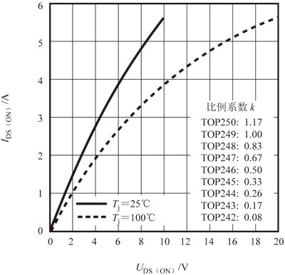 下面對(duì)開關(guān)電源散熱器的設(shè)計(jì)要點(diǎn)作進(jìn)一步分析。以TOPSwitch-GX(TOP242~TOP250)系列單片開關(guān)電源為例,當(dāng)MOSFET導(dǎo)通時(shí)漏-源極導(dǎo)通電流(I DS(ON) )與漏-源極導(dǎo)通電壓(U DS(ON) )的歸一化曲線如圖2所示。