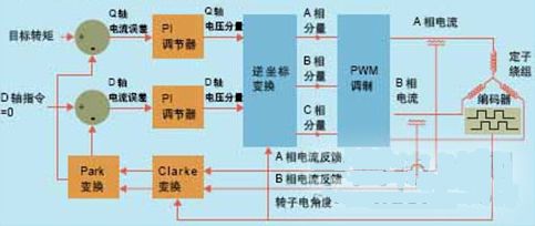 從控制原理上講,磁場定向控制方法的電流環(huán)運行是獨立于電機旋轉(zhuǎn)的。在FOC方法中存在兩個實際的電流環(huán),一個用于Q軸轉(zhuǎn)矩,另一個用于D軸轉(zhuǎn)矩。Q軸轉(zhuǎn)矩電流環(huán)施以來自伺服控制器的用戶目標(biāo)轉(zhuǎn)矩,D軸電流環(huán)則施以零輸進(jìn)指令,以便使不想要的直軸分量降至最低。