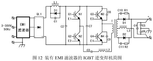 圖 12 是裝有 EMI 濾波器的 IGBT 逆變焊機(jī)原理簡(jiǎn)圖。為了減少對(duì)相鄰設(shè)備的干擾和減少高頻電磁輻射對(duì)焊工健康的影響,在焊機(jī)輸出端也接了濾波器,其中 C4 用于輸出差模干擾的濾出,C5、C6 用于共模干擾濾出。