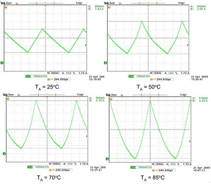 圖4左上圖顯示了在飽和點(diǎn)以下工作的電感器,具有正常的三角電流波形,可由(V/L×Δt)算出。在峰值電流保持相同且溫度升至50℃(右上圖)時(shí),電感電流斜率開始增至1.76A標(biāo)記附近,指示顯示電感器的飽和點(diǎn)隨著溫度上升而向下移動(dòng)。當(dāng)溫度升到70℃, 然后升到85℃時(shí),隨著電感器達(dá)到飽和整個(gè)電流波形最終出現(xiàn)。