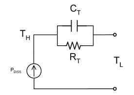 該模擬可以深入進(jìn)行,以描述器件的另一個(gè)熱屬性,稱之為熱容。正如將熱阻模擬為電阻,可以將熱容(CT,單位為J/℃)模擬為電容。將熱容與熱阻并聯(lián)獲得熱阻抗(ZT)。圖1所示為傳導(dǎo)傳熱的簡(jiǎn)化RC模型。能源被模型化為電流源,熱阻抗被模型化為CT與RT并聯(lián)。