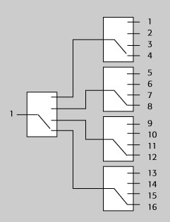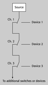 [page]層疊開關架構是多位置開關的一種替代形式。它采用多個繼電器將一個輸入連接到多個輸出。路徑長度(同時決定了相位延遲)是由信號經(jīng)過的繼電器的數(shù)量決定的。