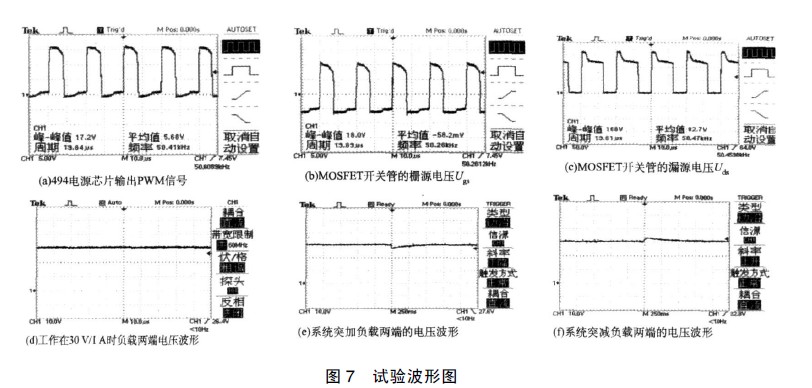 通過調(diào)壓器在供電電源端輸入110 V 的交流電壓, 使得系統(tǒng)穩(wěn)定的工作在30 V、1 A 的負載下, 觀察TL494 電源芯片輸出的驅(qū)動信號波形、MOSFET 開關(guān)管Ugs、Uds 、負載正常工作時的波形、以及突然加載、突然掉載情況, 其試驗波形如圖7。
