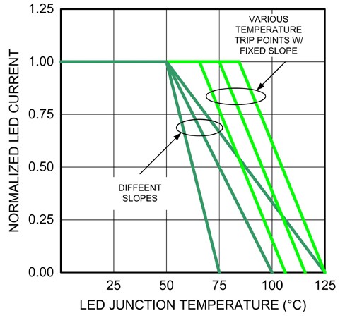 為防止組件遭受破壞或讓使用壽命縮短,必須進(jìn)行熱能管理,且已有多種方法可以解決此問題。圖2為兩種不同的回折曲線,可在溫度上升時(shí)限制LED的電流流量。當(dāng)接面溫度保持在默認(rèn)溫度范圍內(nèi)時(shí),就經(jīng)由主要的控制回路作為電流調(diào)節(jié);但當(dāng)接面溫度超過默認(rèn)范圍時(shí),就會使用另一組控制回路限制電流大小。其中接面溫度的回折點(diǎn)與驅(qū)動電流的衰減率,均可依照不同的應(yīng)用和LED制造商的建議改變。