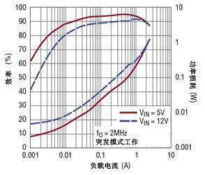 圖 4:突發(fā)模式工作在輕負(fù)載時產(chǎn)生高效率,而低 RDS(ON) 開關(guān)在最大負(fù)載時保持高效率