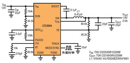 工作頻率在 800kHz 至 4MHz 范圍內(nèi),可用一個 RT 到地之間的外部電阻器編程。就開關(guān)噪聲敏感應(yīng)用而言,LTC3601 和 LTC3604 可在相同的頻率范圍內(nèi)從外部同步,而不管 RT 的狀態(tài)如何。無需外部 PLL 組件實(shí)現(xiàn)同步。
