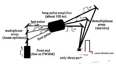 對于準分子激光放大器,由于激活介質(zhì)的上能態(tài)儲能時間很短,必須連續(xù)補充瞬態(tài)儲能(Em)才能獲得高能輸出,即E=EmT/t,其中T是增益時間,t是增益恢復時間。對于電子束泵浦的準分子激光放大器,增益時間可以長達200ns,T/t≈100,這意味著對于單個要放大的短脈沖,只能提取出很小一部分能量。為了持續(xù)提取出放大器中的儲能,通常使用光學多路編碼技術(shù)。