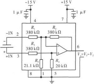 INA117內(nèi)置了380kΩ、20kΩ和21.1kΩ 3個(gè)電阻,因此外部電路省去精密電阻,減少了精密電阻帶來的誤差和系統(tǒng)復(fù)雜程度。圖2是INA117輸出1節(jié)電池電壓的接法,6腳和1腳之間的電壓就是1節(jié)電池兩端的電壓差。