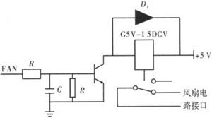 電路如圖6所示,F(xiàn)AN為低電平時(shí),晶體管9014不導(dǎo)通,此時(shí)繼電器無動作;當(dāng)FAN為高電平時(shí),晶體管9014導(dǎo)通,使得繼電器觸點(diǎn)吸合,風(fēng)扇在24V電源電壓的供電下開始工作。