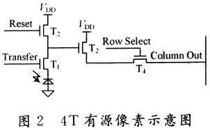 四場(chǎng)效應(yīng)管(4T)有源像素CMOS圖像傳感器的每個(gè)像素由光敏二極管、復(fù)位管T2、轉(zhuǎn)移管T1、源跟隨器T3和行選通開(kāi)關(guān)管T4組成,如圖2所示。