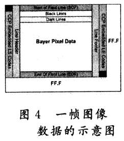 由APS陣列所獲得的圖像信息,經(jīng)過(guò)圖1中列模數(shù)轉(zhuǎn)換器(Column ADC)轉(zhuǎn)換為數(shù)字信號(hào)后,再經(jīng)過(guò)一系列的后續(xù)處理過(guò)程,得到輸出如圖4所示的幀圖像數(shù)據(jù)結(jié)構(gòu)。
