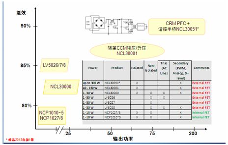 在安森美半導體用于LED照明的AC-DC電源方案中,1至10 W的照明應用中推薦使用NCP1010~5,1至15 W可使用NCP1027/8,這些方案集成了MOS管,適用于隔離和非隔離應用,支持次級PWM調(diào)光、模擬調(diào)光或雙亮度等級調(diào)光,能效高達75-80%;1至30 W的應用可以使用LV5026、5027、5028,支持隔離方案,典型能效85%左右;1至40 W推薦使用NCL30000,可進行初級可控硅調(diào)光,適用于隔離和非隔離方案,隔離方案能效80-85%。40至150 W推薦使用NCL30001,它是一個連續(xù)導電模式(CCM)控制芯片,隔離方案的典型能效85-90%;更大功率推薦使用NCL30051。圖2是這些方案輸出功率與能效的對比。以下將具體介紹這些方案的功能和特點。