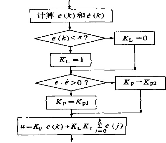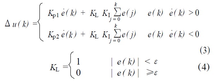③當(dāng)│e(k)│≤ε時,即偏差值e(k)進(jìn)入穩(wěn)態(tài)區(qū)域時,加入積分環(huán)節(jié),可保證系統(tǒng)的控制精度。
