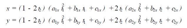 式中a1x , b1x , c1x , a1y , b1y , c1y為Si 段曲線的系數(shù),由Pi , Pi + 1 , Pi + 2三點(diǎn)控制,參變量為t1 ,在公共段范圍內(nèi)t1∈[0. 5, 1 ];式中a2x , b2x , c2x , a2y , b2y , c2y為Si + 1段曲線的系數(shù),由Pi + 1 , Pi + 2 , Pi + 3三點(diǎn)控制,參變量為t2 ,在公共段范圍內(nèi)t2 ∈[0, 0. 5 ]。