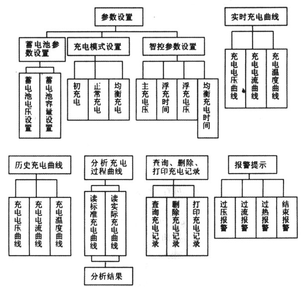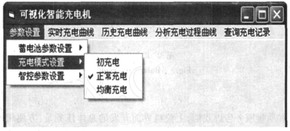 在參數(shù)設(shè)置中可以對(duì)框圖中所示的條目進(jìn)行設(shè)置,使得該系統(tǒng)具有很強(qiáng)的通用性。電動(dòng)車電池一般由幾個(gè)單體組合而成,可以選擇單體個(gè)數(shù)以確定電池組的電壓和容量。該系統(tǒng)提供了如框圖所示的三種充電模式,一般新電池前五次充電要進(jìn)行初充電以充分激活電解質(zhì),當(dāng)單體電量不同時(shí)要均衡充電,其余時(shí)正常充電。還可以按照需求設(shè)置不同充電階段的充電時(shí)間,來(lái)滿足各種電池的不同需求;實(shí)時(shí)充電曲線實(shí)時(shí)地顯示充電電流、電壓和電池溫度;歷史充電曲線可以顯示該電池組充電歷史;通過(guò)分析充電過(guò)程曲線即可了解電池存在的問(wèn)題,如:蓄電池缺乏電解液、電解液比重不符合要求或蓄電池單體存在差異等,從而及時(shí)的對(duì)電池進(jìn)行保養(yǎng);該系統(tǒng)還提供了按日期或電池編號(hào)查詢、刪除充電記錄的數(shù)據(jù)庫(kù)功能,方便了操作;報(bào)警提示用來(lái)告知用戶充電的過(guò)壓、過(guò)流、過(guò)熱情況以及充電是否結(jié)束。