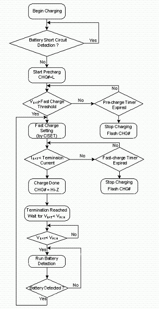 圖6所示為鋰離子電池充電器的標準充電流程,首先充電IC偵測是否有輸出短路或是過載的保護模式,若系統(tǒng)一切正常接著偵測電池初始電壓是否達到 3V以上,高于3V者就直接以快充模式進行高電流充電,若電池低于3V者,進入預充電模式,以快充的10%進行充電,喚醒電池并避免電池損壞。在預充電階段,仍隨時偵測電池電壓,達到3V后可隨即切入快充模式。