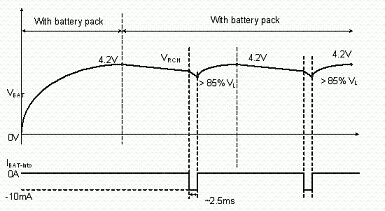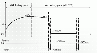 使用者亦有可能在充電或式充電完畢后,在未將電源移除的情況下,即抽離電池的情況。為避免造成危險,IC內(nèi)部應具有如圖7, 8的電池存在偵測機制。充電IC會以短時間脈沖(每370ms產(chǎn)生2ms的脈沖)方式抽取電池電流,此時若電池存在,則偵測到的電池電壓應大于一預設(shè)閥值;若電池已切離,則充電IC偵測到一低電壓,即可判定為電池斷開狀態(tài),并將電池端電壓切斷,保護使用者安全。
