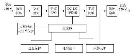 本文設(shè)計(jì)的整流模塊的工作原理框圖如圖2 所示,工作時(shí), 模塊首先通過過防雷處理和濾波對(duì)輸入的三相交流進(jìn)行處理,這樣才能保證模塊后級(jí)電路的安全; 經(jīng)過處理后的三相交流經(jīng)過整流和無源PFC 后轉(zhuǎn)換成高壓直流時(shí),這時(shí)轉(zhuǎn)換的高壓直流要經(jīng)過DC/DC變換器再次轉(zhuǎn)換成可變的直流電壓輸出; 另外模塊控制部分還有負(fù)責(zé)過壓、過流以及短路保護(hù)等作用,這樣才能保證輸出電壓的穩(wěn)定, 也同時(shí)能對(duì)模塊各部件進(jìn)行保護(hù)。模塊還在遠(yuǎn)程監(jiān)控中提供了 四遙 (遙控、遙調(diào)、遙測(cè)、遙信) 接口。[page]