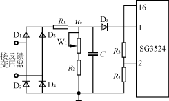 反饋調(diào)壓電路圖如圖7所示。當(dāng)逆變器正常工作時(shí),逆變器的輸出信號(hào)接反饋?zhàn)儔浩?,其二次電壓?jīng)整流,濾波,分壓得到反饋電壓uo,顯然,uo的大小正比于逆變器的輸出電壓。調(diào)節(jié)W1可調(diào)節(jié)負(fù)反饋電壓的大小,從而調(diào)節(jié)逆變器輸出電壓的幅值。uo控制信號(hào)被送到SG3524-1芯片的誤差放大器的反相端腳1。誤差放大器的同相端腳2接參考電平。這樣,SG3524的輸出脈沖的占空比就受到反饋信號(hào)的控制。調(diào)節(jié)過(guò)程是這樣的,當(dāng)逆變器輸出因突加負(fù)載而降低時(shí),它會(huì)使加在SG3524-1的腳1的輸入反饋電壓下降,這會(huì)導(dǎo)致SG3524-1輸出脈沖占空比增加,從而使得Boost電路輸出電壓升高,逆變橋的直流電壓升高,逆變器輸出交流電壓升高。反之亦然??梢?jiàn),正是通過(guò)SG3524-1的脈寬調(diào)制組件的控制作用,實(shí)現(xiàn)了整個(gè)逆變器的輸出自動(dòng)穩(wěn)壓調(diào)節(jié)功能。