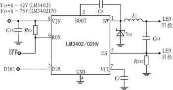 高亮度白光二極管一般采用恒流電源驅(qū)動(dòng)。因?yàn)殡S著LED逐漸變熱,其電壓降將減小,而且若LED串由恒壓電源供電的話,電源往往會(huì)持續(xù)提供過(guò)多的電流,使輸出電壓增大,直到電源達(dá)到電流限值或LED失效。脈寬調(diào)制方式是用較高的頻率開關(guān)LED,開關(guān)頻率超出人一般能夠察覺(jué)的范圍,給人一種LED總亮的假象,現(xiàn)在普遍采用脈寬調(diào)制方式調(diào)節(jié)LED的亮度,在某些應(yīng)用中,調(diào)光比可達(dá)5 000:1,常用的LED驅(qū)動(dòng)有降壓型(Buck)、升壓型(Boost)、升降壓型(Buck~Boost)等3種。LM3402是一款由可控電流源衍生的降壓型穩(wěn)壓器,輸入電壓范圍涵蓋整個(gè)汽車應(yīng)用領(lǐng)域,內(nèi)置MOS管最多可以驅(qū)動(dòng)5顆LED,性價(jià)比高,且接受領(lǐng)域較廣、線路簡(jiǎn)潔實(shí)用,是眾多LED驅(qū)動(dòng)IC中間的佼佼者。
