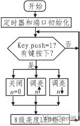 控制器程序根據(jù)3個(gè)按鈕的輸入狀態(tài),實(shí)現(xiàn)開關(guān)或亮度調(diào)節(jié),并將亮度狀態(tài)在4個(gè)指示燈上顯示出來(lái)。利用微處理器自身集成的EEPROM單元,可隨時(shí)保存亮度狀態(tài)n(PWM占空比)。主程序流程框圖如圖3所示。