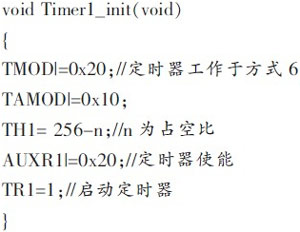微處理器P89LPC932內(nèi)部定時(shí)器TO/T1的PWM輸出與計(jì)數(shù)輸入和定時(shí)器觸發(fā)輸出占用相同的管腳,發(fā)生定時(shí)器溢出時(shí)自動(dòng)觸發(fā)端口輸出。此功能通過(guò)AUXR1寄存器中的控制位ENT0和ENT1分別使能定時(shí)器0和1。該模式打開時(shí),在首次定時(shí)器溢出前端口的輸出為邏輯1。為了使該模式生效,必須清零C/T位以選擇PCLK作為定時(shí)器的時(shí)鐘源。定時(shí)器初始化設(shè)置參考程序如下: