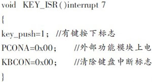 經(jīng)檢測(cè),在同等照度要求的情況下,采用LED調(diào)光控制系統(tǒng)的功耗較白熾燈降低90%以上,當(dāng)然為進(jìn)一步降低能耗,節(jié)能方法的探究仍然具有十分重要的意義。在多數(shù)時(shí)間,HBLEDs可能處于熄滅狀態(tài),若控制系統(tǒng)處于待機(jī)狀態(tài)或掉電狀態(tài),可將功耗降低到最低;或?qū)FF端口接地,也可將LM3402置于一個(gè)極低的低功率關(guān)機(jī)狀態(tài)。將微處理器P89LPC932的電源控制寄存器PCONA設(shè)置為0xFF時(shí),外部功能模塊掉電;將電源控制寄存器PCON設(shè)置為03H時(shí),可將微處理器處于完全掉電狀態(tài),只有在中斷觸發(fā)的時(shí)候,才能喚醒,隨即給外部功能模塊上電,微處理器開始工作。微處理器主要通過(guò)鍵盤中斷喚醒,鍵盤中斷參考程序如下: