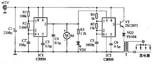 IC1、IC2選用兩塊時(shí)基電路CB555,或選用一塊雙時(shí)基電路CB556。注意,CMOS時(shí)基電路CB7555或CB7556因驅(qū)動(dòng)電流較小,不適合本機(jī)使用。開關(guān)管VT選用2SC2073等中功率管。二極管VD2選用FR104等快恢復(fù)整流管。風(fēng)扇M可選用12V、150mA左右的計(jì)算機(jī)CPU用的散熱風(fēng)扇,其體積較小、厚度薄、噪聲很低,比較適合本制作使用,也可用12V玩具電機(jī)配以自制的風(fēng)扇葉片代用。