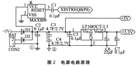 這個電源回路除了可以提供5v和3.3v的電源以外,還為系統(tǒng)掉電保護提供了延時及預警功能,通過軟件的配合可以實現(xiàn)系統(tǒng)的掉電保護機制。正常情況下,由供電回路1給整個系統(tǒng)供電。當系統(tǒng)由于意外原因掉電時,由于輸入的比較電壓降低,這樣MAX809 模塊輸出電壓產(chǎn)生翻轉(zhuǎn)為系統(tǒng)提供掉電中斷預警信號,中斷請求通過外部中斷引腳XREQ0產(chǎn)生;同時供電回路2開始啟用。通過大電容C3、c4放電,繼續(xù)為系統(tǒng)提供一段供電電壓,支持掉電中斷服務程序完成。供電回路2只給最小系統(tǒng)供電,并不給耗電量大的外圍部件供電。這樣,給最小系統(tǒng)的供電時間足夠長,可以完成敏感數(shù)據(jù)的保護操作。
