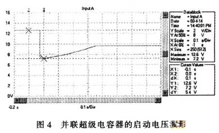 蓄電池是汽車中的關鍵電器部件,其性能直接影響汽車的啟動?,F(xiàn)在的汽車啟動無一例外地采用啟動電動機啟動方式。在啟動過程中特別是在啟動瞬間,由于啟動電動機轉速為零,不產(chǎn)生感生電勢,故啟動電流:I=E/(RM+RS+RL);其中:E為蓄電池空載端電壓,RM為啟動電動機的電樞電阻,RS為蓄電池內(nèi)阻、RL為線路電阻。由于RM、RB、RL均非常低,啟動電流非常大。例如用12V、45Ah的蓄電池啟動安裝1.9L柴油機的汽車,蓄電池的電壓在啟動瞬間由12.6V降到約3.6V,啟動過程的蓄電池電壓波形如圖1所示。啟動瞬時的電流達550A,約為蓄電池的12C的放電率>啟動過程的蓄電池電流波形如圖2所示。電流傳感器的電流/電壓變換比率為100A/V。盡管車用蓄電池是啟動專用蓄電池,可以高倍率放電,但從圖l可以看出,10倍以上高倍率放電時的蓄電池性能變得很差,而且,如此高倍率放電對蓄電池的損傷也是非常明顯的。啟動過程的電壓劇烈變化也是極強的電磁干擾,可以造成電氣設備掉電,迫使電氣設備在發(fā)電機啟動過程結束后重新上電,計算機在這個過程中非常容易死機。因此,從改善汽車電氣設備的電磁環(huán)境、改善汽車的啟動性能和蓄電池性能或延長蓄電池使用壽命來考慮,改善汽車電源在啟動過程中的性能是必要的。解決問題的方案之一是加大蓄電池的容量,但需要增加很多,并使其體積增大,這并不是好的選擇。而將超級電容器與蓄電池并聯(lián)可以很好地解決這個問題。