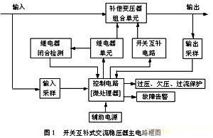 本穩(wěn)壓器由補(bǔ)償變壓器組合單元、繼電器單元、開關(guān)互補(bǔ)電路、控制電路、過(guò)欠壓以及過(guò)流保護(hù)及故障告警電路、輔助電源等部分組成,整機(jī)框圖如下:
